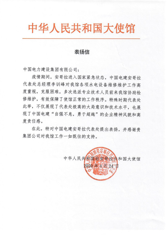 當(dāng)?shù)貢r(shí)間4月24日,中國(guó)電建安哥拉代表處收到來自中國(guó)駐安哥拉大使館的表揚(yáng)信,信中高度贊揚(yáng)了中國(guó)電建安哥拉代表處在安哥拉進(jìn)入國(guó)家緊急狀態(tài)的疫情期間,克服困難,對(duì)使館各項(xiàng)水電設(shè)備維修維護(hù)工作高度重視,多次選派專業(yè)技術(shù)人員前往使館協(xié)助檢修維護(hù),為使館在疫情期間的正常秩序提供了有效保障。表揚(yáng)信對(duì)中國(guó)電建“自強(qiáng)不息,勇于超越”的企業(yè)精神風(fēng)貌和社會(huì)責(zé)任感給予了肯定,并感謝中國(guó)電建對(duì)使館工作一如既往的支持。