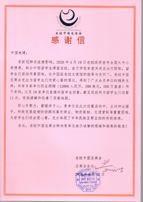 6月12日,中國電建老撾代表處收到了來自老撾中國總商會和老撾國立大學中國留學生發(fā)來的感謝信,對在老撾新冠疫情防控期間,中國電建及廣大員工獻出愛心,履行企業(yè)社會責任的積極表現(xiàn)給予了充分肯定和感謝。