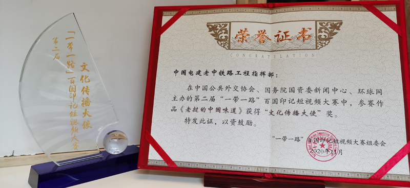 11月20日,由中國(guó)公共外交協(xié)會(huì)、國(guó)務(wù)院國(guó)資委新聞中心和環(huán)球網(wǎng)聯(lián)合主辦的第二屆“一帶一路”百國(guó)印記短視頻大賽頒獎(jiǎng)典禮在武漢舉行,中國(guó)公共外交協(xié)會(huì)會(huì)長(zhǎng)吳海龍、國(guó)務(wù)院國(guó)資委新聞中心副主任張義豪、湖北省委宣傳部一級(jí)巡視員榮罕君、環(huán)球時(shí)報(bào)副總編輯謝戎彬出席了頒獎(jiǎng)典禮并致辭。此外,多國(guó)駐華使館外交官、部分獲獎(jiǎng)中央企業(yè)代表以及多國(guó)媒體記者也參加了此次活動(dòng)。公司報(bào)送的來(lái)自中老鐵路視頻作品《老撾的中國(guó)味道》和《老撾翻譯阿爽的成長(zhǎng)故事》分別榮獲“文化傳播大使獎(jiǎng)”和“優(yōu)秀作品獎(jiǎng)”。